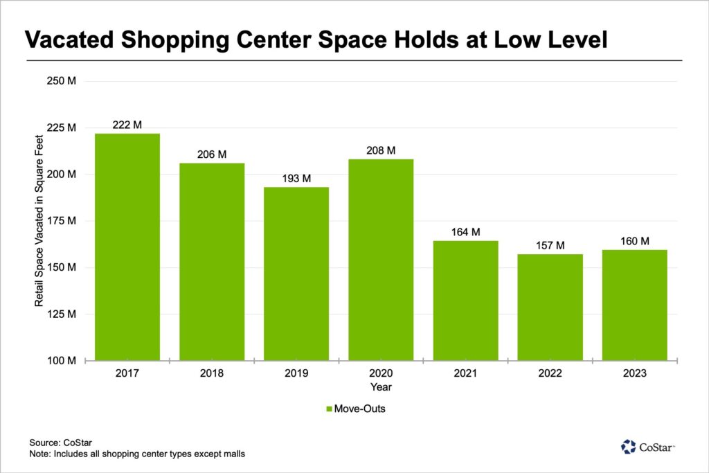 97.4% of shopping center space was retained in 2023, reflecting low move-outs.